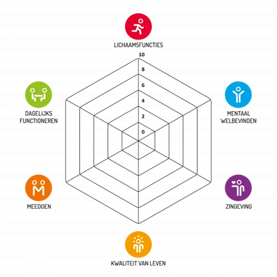 Een model met een bredere kijk op gezondheid, uitgewerkt in zes dimensies. Doormiddel van het invullen van een vragenlijst krijgen patiënt en zorgverlener inzicht in de leefstijl en het algehele welzijn van de patiënt. Dit kan gebruikt worden om verandergesprek te voeren: met welk onderdeel wil je aan de gang? Dit is nu een 4; welk cijfer zou je naartoe willen? Wat staat daarbij in de weg, of wat zou je daarmee kunnen helpen?
